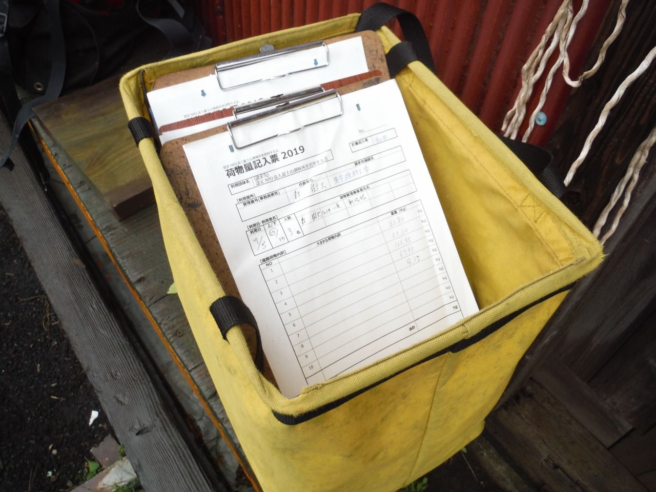 この日、朝は強風、暴雨。山頂も風速30㍍オーバーとのことで、伊倉さんの判断で登山中止。午後の事前積込の際の天候も懸念していたが、小雨で、作業終了間際には雨もやみ、無事に積込完了…7月4日(水)御殿場作業日報より
