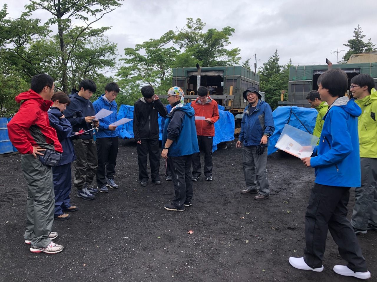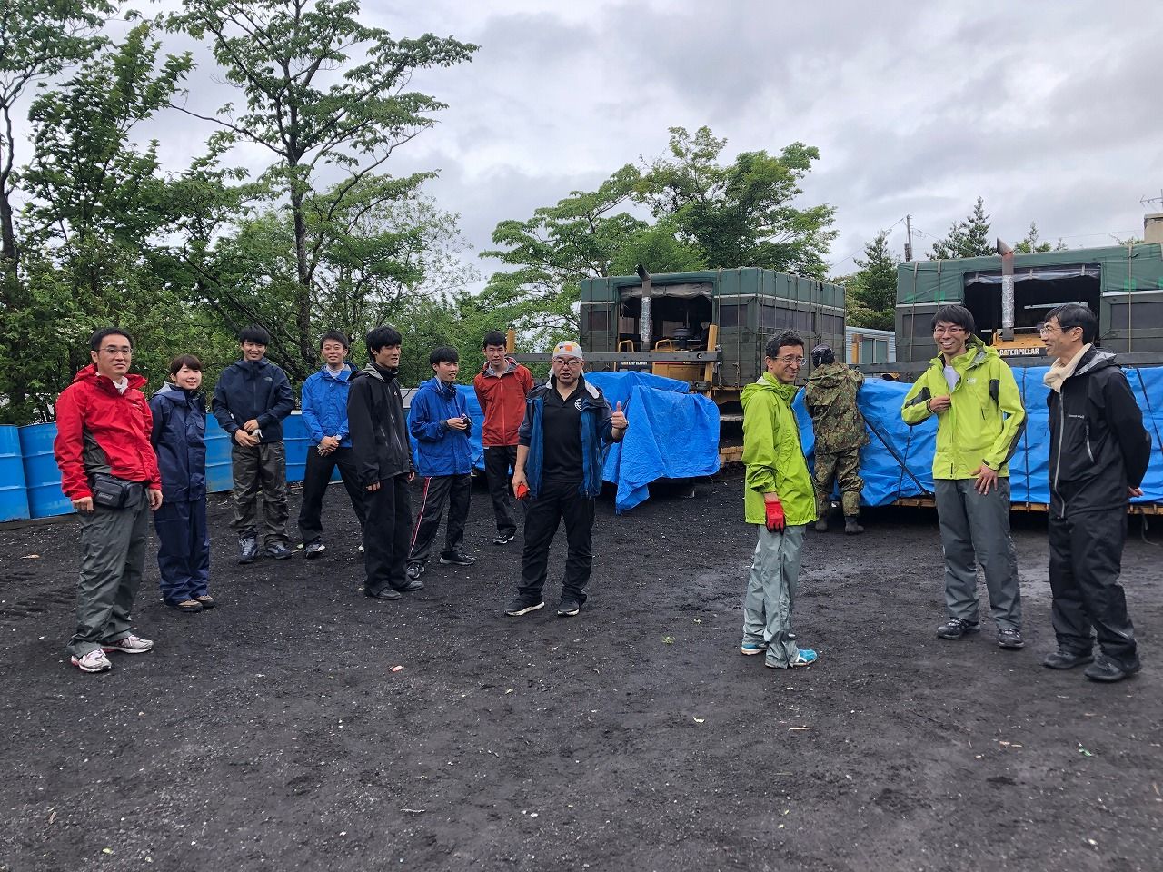 荷物のブル積みこみが終わった大気化学グループのメンバー。7月4日(水)雨上がりの太郎坊にて