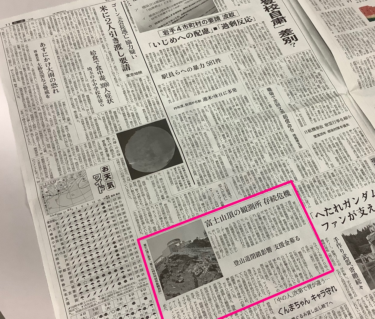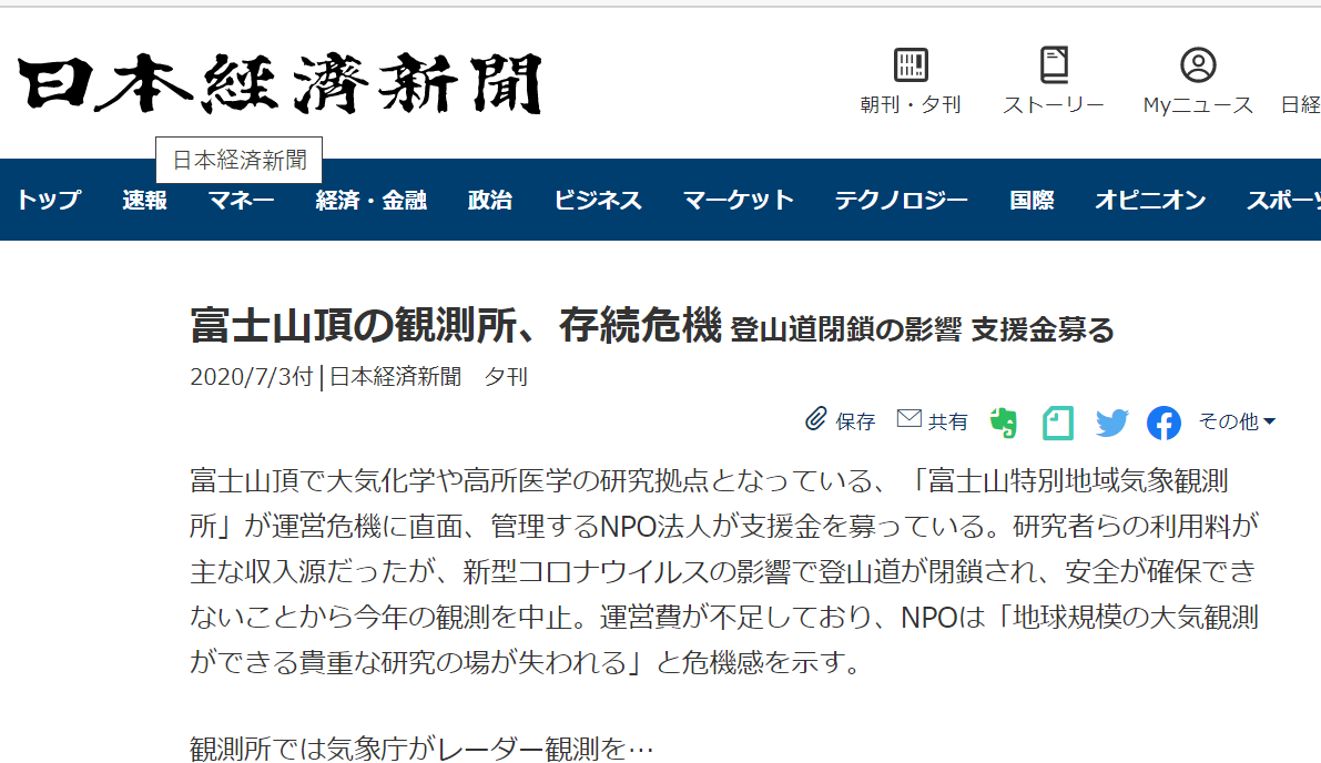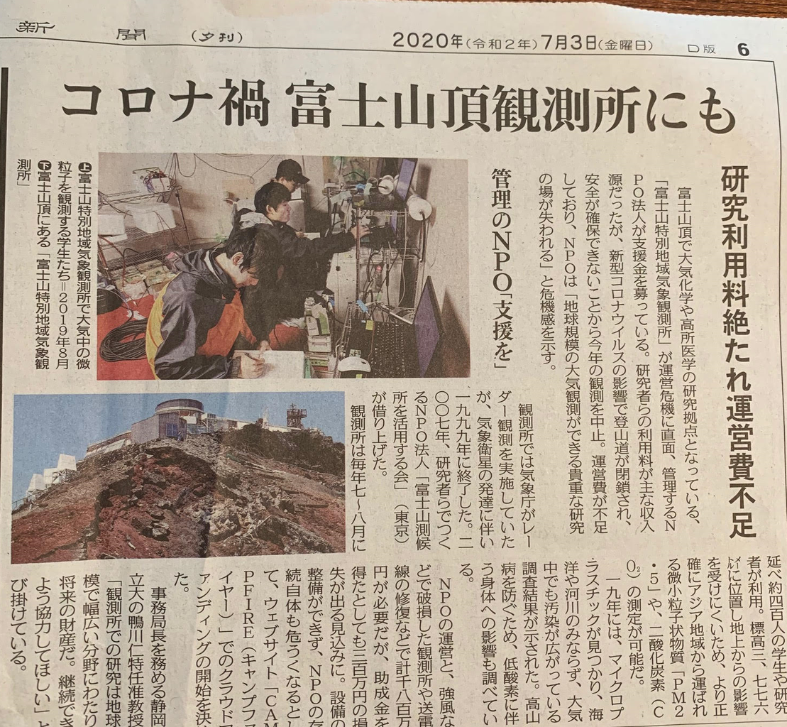 富士山頂で大気化学や高所医学の研究拠点となっている、「富士山特別地域気象観測所」が運営危機に直面、管理するNPO法人が支援金を募っている。研究者らの利用料が主な収入源だったが、新型コロナウイルスの影響で登山道が閉鎖され、安全が確保できないことから今年の観測を中止。運営費が不足しており、NPOは「地球規模の大気観測ができる貴重な研究の場が失われる」と危機感を示す。