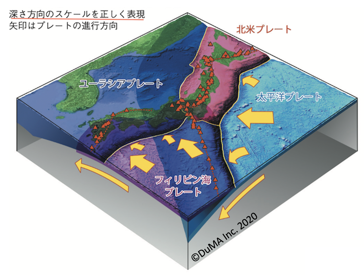 この図は、多分日本で初めて垂直方向の誇張をせず、実際のプレートの沈み込みの角度を表現したものです。私どもが調べた限り、気象庁の図も、地震調査研究推進本部の図も沈み込むプレート角度が急すぎるのです。