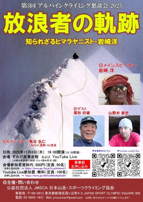今回は、ヒマラヤを中心としたハイレベルな登山と旅を実践し続け、また多くのクライマーとの交流を結んできた岩崎洋氏の軌跡を振り返りつつ、日本のアルパインクライミングが持つ可能性と課題について語り合います。ゲストにアルパインクライマーの山野井泰史氏、日本ヒマラヤ協会の尾形好雄氏をお迎えし、単なる技術や経験談に留まらない、「登るとは何か」という登山の本質を追求する懇談会です。