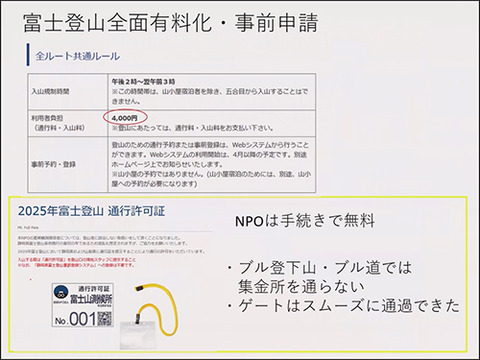 ① 今年から静岡方面の登山も有料になったこと、それに伴う「許可証」など