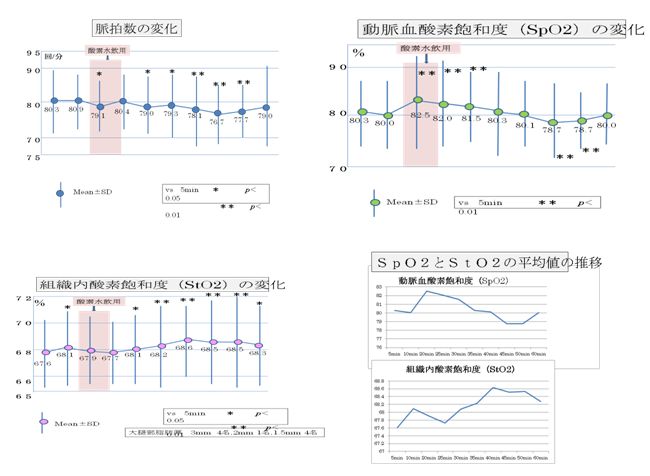 SpO2は飲用開始直後に一過性に上昇し、StO2は遅れて上昇するが、これは組織に分布するのに時間を要するためと思われる。 脈拍数の減少は安静による影響があると思われる。