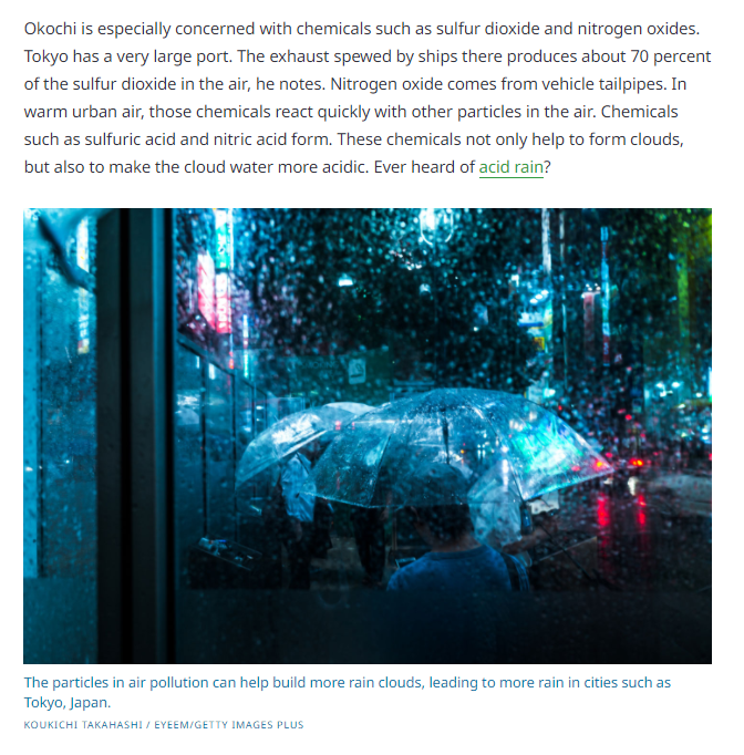 Other scientists have confirmed the urban rain effect in places such as China and other parts of Asia. Hiroshi Okochi is one of them. He’s an environmental chemist at Waseda University in Tokyo, Japan. In one hour, heavy rains can drop 3 cm — or more than an inch — of rain. In Tokyo, he says, “the number of heavy rainfalls in a decade has almost doubled.”