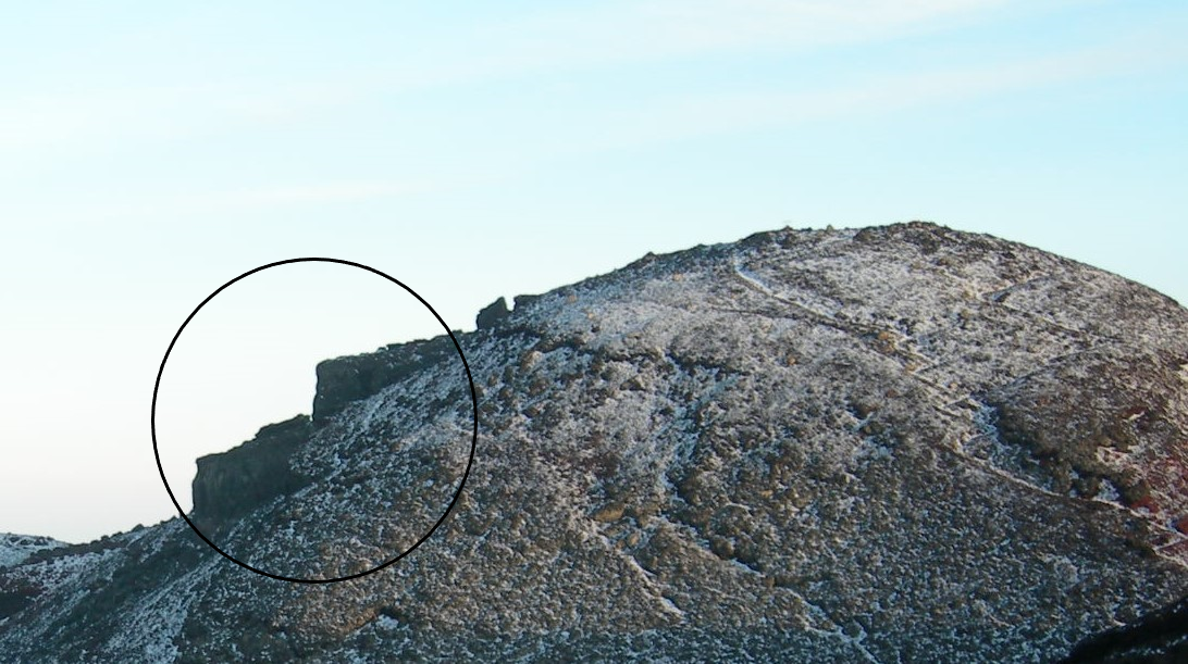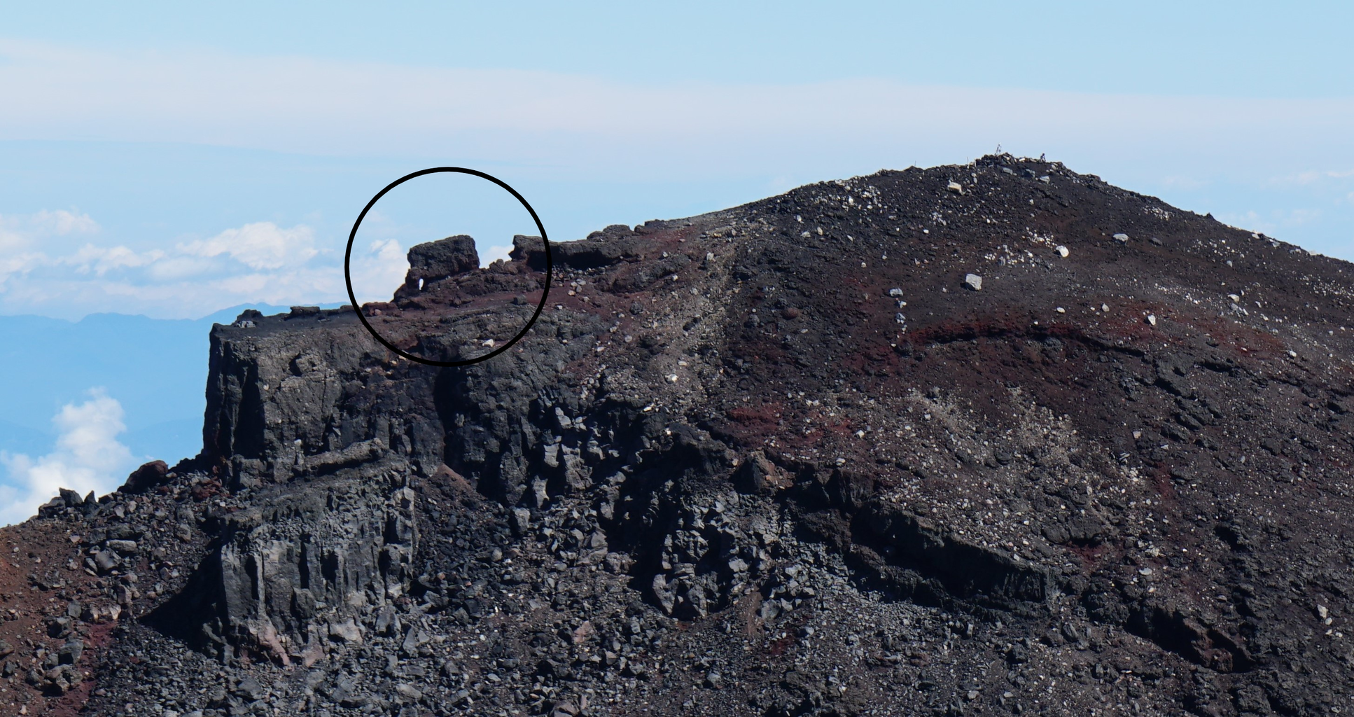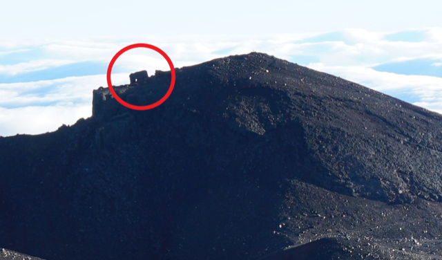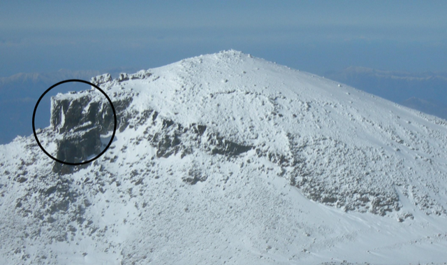 (釈迦の)割れ石とは?富士山頂にある白山岳の端にある縦に割れたようになっている岩です。白山岳が昔釈迦岳と呼ばれていたので「シャカの割れ石」と言われていました。今は危険なため通行止めとなっています。