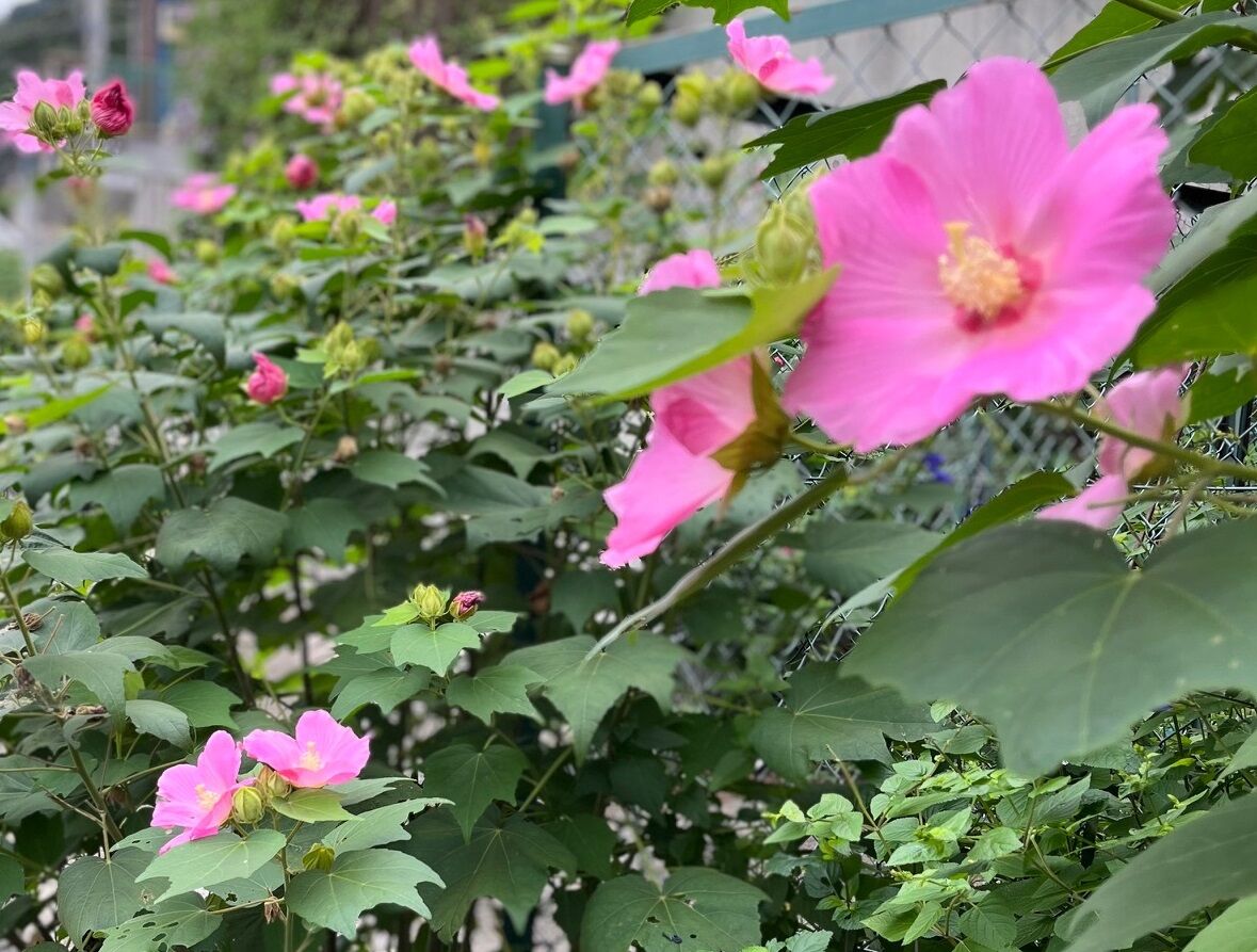 「木芙蓉」のほとんどの花は一日中ピンク色の芙蓉が占めており、夏~秋の花です。