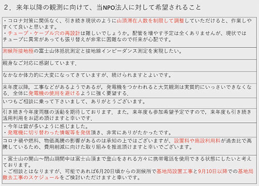 発動発電機の利用を出来るだけ少なくしてほしいこと、気象庁の業者との対応などについても質問があり、今後の課題になりそうです。