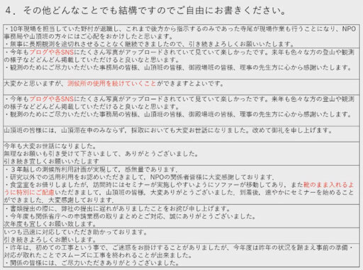 15:00に加藤俊吾理事(学術科学委員長)の進行で、最初に今年のトピックスとして、前回のブログで紹介した御来光カメラの纏めが紹介され、「今年の御来光は思ったより高頻度で見られた」と導入から始まり、次いで、恒例の参加者によるアンケートを紹介しながら、今年の夏期観測を振り返りました。