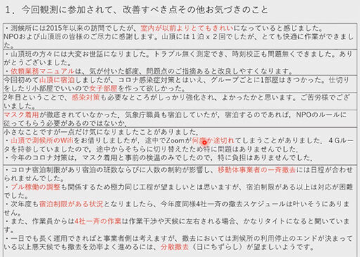各参加者の意見に対して、岩崎洋山頂班長の回答、時には事務局と気象庁の話し合いの内容について、「どうしてほしいかが返ってこない」という苦言も含めて、意見交換がありました。