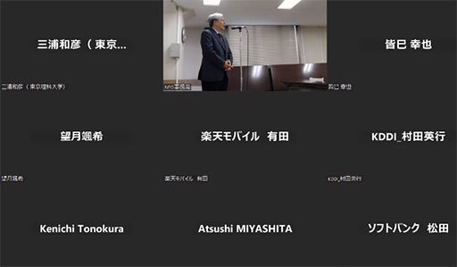 電話グループのソフトバンク・松田様、ドコモ・井上様、楽天モバイル・有田様、KDDI・村田様のお話も伺いました。トライアルの東京大学の戸野倉先生は会場から参加され、同じく法政大の学生・望月さんはZoom参加でした。